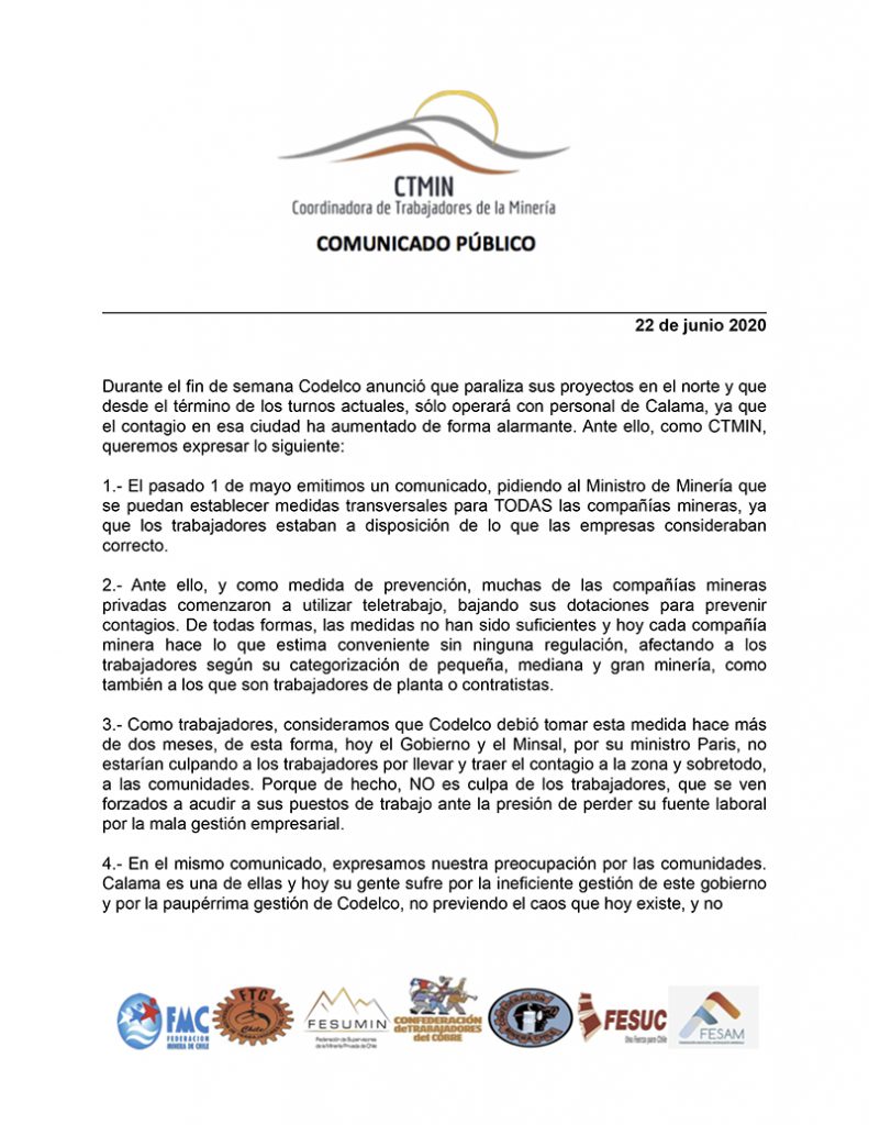 Durante el fin de semana Codelco anunció que paraliza sus proyectos en el norte y que desde el término de los turnos actuales, sólo operará con personal de Calama, ya que el contagio en esa ciudad ha aumentado de forma alarmante. Ante ello, como CTMIN, queremos expresar lo siguiente: