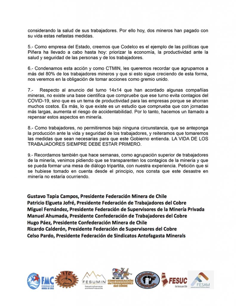 3.- Como trabajadores, consideramos que Codelco debió tomar esta medida hace más de dos meses, de esta forma, hoy el Gobierno y el Minsal, por su ministro Paris, no estarían culpando a los trabajadores por llevar y traer el contagio a la zona y sobretodo, a las comunidades. Porque de hecho, NO es culpa de los trabajadores, que se ven forzados a acudir a sus puestos de trabajo ante la presión de perder su fuente laboral por la mala gestión empresarial.