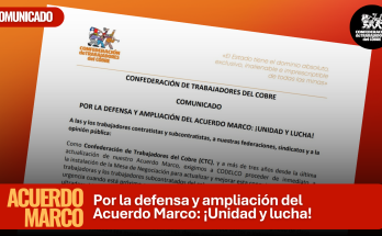 CONFEDERACIÓN DE TRABAJADORES DEL COBRE COMUNICADO POR LA DEFENSA Y AMPLIACIÓN DEL ACUERDO MARCO: ¡UNIDAD Y LUCHA! A las y los trabajadores contratistas y subcontratistas, a nuestras federaciones, sindicatos y …