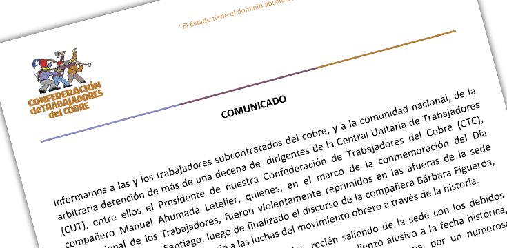 Informamos a las y los trabajadores subcontratados del cobre, y a la comunidad nacional, de la arbitraria detención de más de una decena de  dirigentes de la Central Unitaria de Trabajadores (CUT), entre ellos el Presidente de nuestra Confederación de Trabajadores del Cobre (CTC), compañero Manuel Ahumada Letelier, quienes, en el marco de la conmemoración del Día Internacional de los Trabajadores, fueron violentamente reprimidos en las afueras de la sede central de la CUT en Santiago, luego de finalizado el discurso de la compañera Bárbara Figueroa, presidenta de la CUT, en homenaje a las luchas del movimiento obrero a través de la historia.