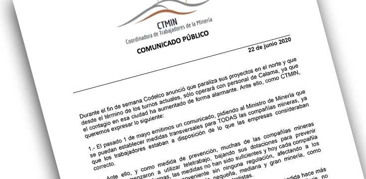 Durante el fin de semana Codelco anunció que paraliza sus proyectos en el norte y que desde el término de los turnos actuales, sólo operará con personal de Calama, ya que el contagio en esa ciudad ha aumentado de forma alarmante. Ante ello, como CTMIN, queremos expresar lo siguiente: