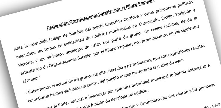 Ante la extendida huelga de hambre del machi Celestino Córdova y otros prisioneros políticos mapuches, las tomas en solidaridad de edificios municipales en Curacautín, Ercilla, Traiguén y Victoria, y los violentos desalojos de estos por parte de grupos de civiles racistas, desde la articulación de Organizaciones Sociales por el Pliego Popular, nos pronunciamos en los siguientes términos: