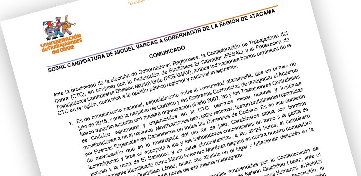 Ante la proximidad de la elección de Gobernadores Regionales, la Confederación de Trabajadores del Cobre (CTC), en conjunto con la Federación de Sindicatos El Salvador (FESAL) y la Federación de Trabajadores Contratistas División MantoVerde (FESAMAV), ambas federaciones brazos orgánicos de la CTC en la región, comunica a la opinión pública regional y nacional lo siguiente: