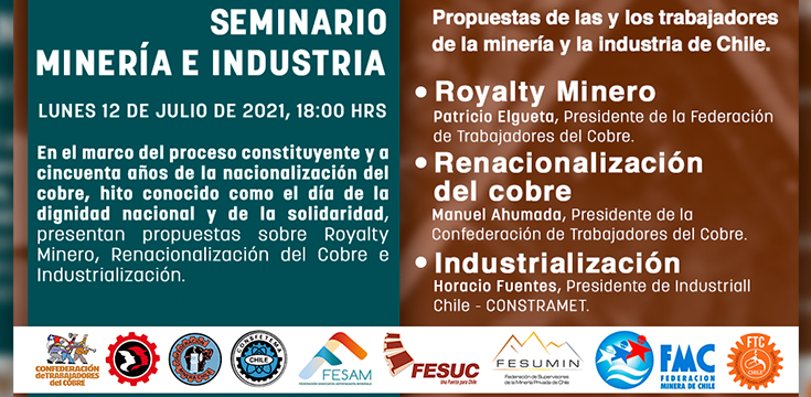 Con la presentación de propuestas sobre Royalty Minero, Renacionalización del Cobre e Industrialización por parte de organizaciones de trabajadoras y trabajadores del cobre y la industria, este lunes 12 de julio y a partir de las 18:00 horas, se realizará el Seminario Minería e Industria.