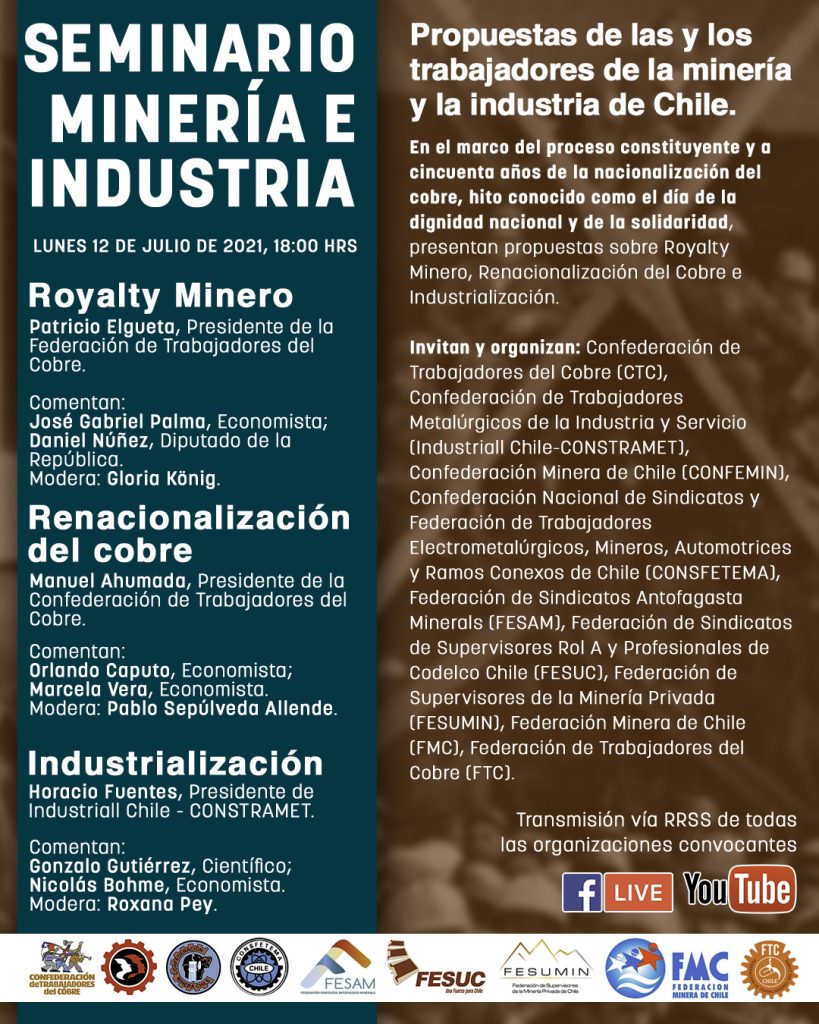 Finalmente, el Seminario Minería e Industria, que es organizado y convocado por la Confederación de Trabajadores del Cobre (CTC), la Confederación de Trabajadores Metalúrgicos de la Industria y Servicio (Industriall Chile-CONSTRAMET), la Confederación Minera de Chile (CONFEMIN), la Confederación Nacional de Sindicatos y Federación de Trabajadores Electrometalúrgicos, Mineros, Automotrices y Ramos Conexos de Chile (CONSFETEMA), la Federación de Sindicatos Antofagasta Minerals (FESAM), la Federación de Sindicatos de Supervisores Rol A y Profesionales de Codelco Chile (FESUC), la Federación de Supervisores de la Minería Privada (FESUMIN), la Federación Minera de Chile (FMC) y la Federación de Trabajadores del Cobre (FTC), contará con la participación y comentarios de las y los economistas Gabriel Palma, Orlando Caputo, Marcela Vera y Nicolás Bohme, a quienes además se suman el Diputado Daniel Núñez, Pablo Sepúlveda Allende y Roxana Pey.
