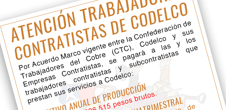 Por Acuerdo Marco vigente entre la Confederación de Trabajadores del Cobre (CTC), Codelco y sus Empresas Contratistas, se pagará a las y los trabajadores contratistas y subcontratistas que prestan sus servicios a Codelco: