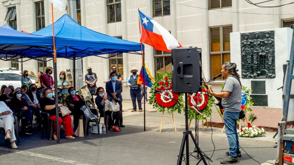 El acto, como ya es tradición, se realizó a un costado de la escuela, en la esquina de Amunátegui con Sargento Aldea, lugar donde se encuentra emplazado el monolito que recuerda el triste y masivo asesinato de trabajadores pampinos (obreros del salitre, que se movilizaron en protesta por mejores condiciones laborales y de vida) y sus familias a manos del Ejército y la Marina de Chile.
