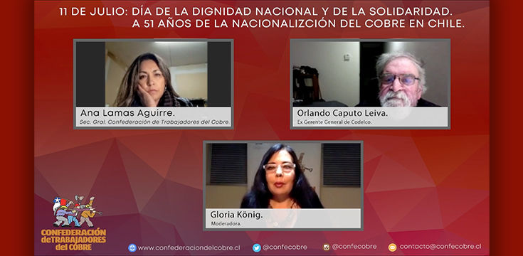 Han pasado los años y este acontecimiento, lejos de quedar atrás, hoy cobra mas vigencia que nunca. En esta oportunidad Ana Lamas Aguirre, Secretaria General de la Confederación de Trabajadores del Cobre; junto a Orlando Caputo Leiva, ex Gerente General de Codelco durante el gobierno del Presidente Salvador Allende, nos comparten en un conversatorio sus reflexiones en torno a esta fecha y nos hablan de la importancia histórica de la nacionalización del cobre, sobre todo de la necesidad de renacionalizarlo efectivamente. En la misma línea, y debido a la sistemática y progresiva desnacionalización del cobre, que en la práctica también ha significado ir perdiendo soberanía, se refieren a la cantidad de recursos que Chile ha dejado de percibir, recursos que se traducen en la posibilidad de financiar y construir una serie de derechos sociales e infraestructura que el país urgentemente necesita. En ese sentido, Ana Lamas Aguirre, se refirió al proceso constituyente y a la iniciativa popular de norma constitucional que la CTC, junto a históricos colaboradores, entre ellos los economistas Graciela Galarce y el propio Orlando Caputo, promovió y que finalmente permitió traspasar a la propuesta de nueva constitución el histórico párrafo de la Nacionalización del cobre (de 1971, hecha bajo el gobierno de la Unidad Popular) que establece que el Estado tiene el dominio absoluto, exclusivo, inalienable e imprescriptible de todas las minas. Por su parte, Orlando Caputo Leiva nos señala que la mayoría del pueblo está por la renacionalización del cobre, por una renacionalización efectiva, y que a partir de la experiencia y demostraciones políticas de los últimos años, la perspectiva y posibilidades de lograrlo aún persisten.