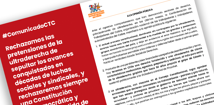 - Las trabajadoras y trabajadores subcontratados del cobre rechazamos las pretensiones de la ultraderecha de sepultar los avances conquistados en décadas de luchas sociales y sindicales, y rechazaremos siempre una Constitución antidemocrática y hecha a la medida de los poderosos grupos económicos. Como clase trabajadora defenderemos siempre nuestras conquistas laborales y sociales, así como la democracia que ha costado tanta sangre y tantas vidas de chilenos y chilenas en los últimos 50 años.