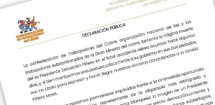 La Confederación de Trabajadores del Cobre, organización nacional de las y los trabajadores subcontratados de la Gran Minería del cobre, lamenta la trágica muerte del ex Presidente Sebastián Piñera en el fatal accidente aéreo ocurrido hace algunos días, y, si bien mantuvimos una postura crítica frente a su gobierno en sus dos períodos, eso no obsta para expresar y hacer llegar nuestras sinceras condolencias a la familia Piñera Morel.