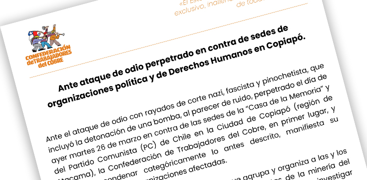 Ante el ataque de odio con rayados de corte nazi, fascista y pinochetista, que incluyó la detonación de una bomba, al parecer de ruido, perpetrado el día de ayer martes 26 de marzo en contra de las sedes de la “Casa de la Memoria” y del Partido Comunista (PC) de Chile en la Ciudad de Copiapó (región de Atacama), la Confederación de Trabajadores del Cobre, en primer lugar, y junto con condenar categóricamente lo antes descrito, manifiesta su solidaridad con las organizaciones afectadas.
