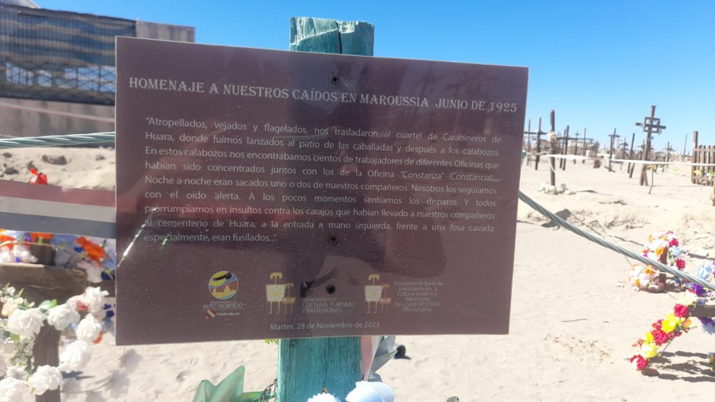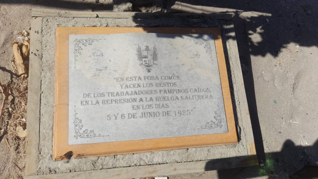 Actividades realizadas - Sábado 01 de junio: visita y homenaje a los caídos en la Salitrera Maroussia, perteneciente al Cantón Salitrero de Huara; - Miércoles 05 de junio: charla en el Liceo de Pozo Almonte, a cargo de la profesora de la Universidad Arturo Prat (UNAP), María Fernanda Guajardo, sobre la huelga del salitre en 1925 y los sucesos de La Coruña y salitreras aledañas; - Jueves 06 de junio: romería y homenaje a los caídos en la Salitrera Maroussia y enterrados en la fosa común del Cementerio de Huara, donde se llevó a cabo el depósito de ofrendas florales. Después se desarrolló una convivencia comunitaria en el camping del pueblo, organizada con el apoyo de de Cultura y Turismo de la Municipalidad de Huara; - Sábado 08 de junio: visita a Salitrera La Coruña, del cantón salitrero Soledad. Acto y homenaje en la fosa común del Cementerio de Alto San Antonio y depósito de ofrendas florales a los caídos en La Coruña y oficinas aledañas, con apoyo de Cultura de la Municipalidad de de Pozo Alomonte.