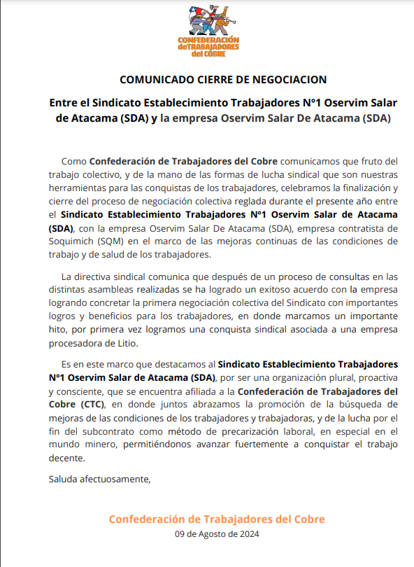 Comunicado / Confederación / El litio para Chile / Federaciones / Nacional / Negociación Colectiva / Noticias / Regiones / Sindicatos / TrabajadoresComunicado por exitoso cierre de Negociación 09/08/202409/08/2024 - by CTCprensa #ComunicadoCTC | Compartimos comunicado por exitoso cierre de Negociación entre el Sindicato Establecimiento Trabajadores Nº1 Oservim Salar de Atacama (SDA) y la empresa Oservim Salar De Atacama (SDA). Comparte