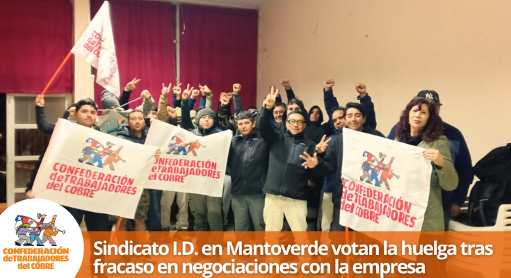 Los trabajadores del Sindicato I.D., una empresa contratista que opera en MantoVerde, Región de Atacama, y que hace algunos meses se afilió a la Federación de Trabajadores Contratistas División MantoVerde (FESAMAV), brazo orgánico de la CTC, han decidido ejercer su legítimo derecho a la huelga a partir de mañana después de que las negociaciones con la empresa no llegaran a un acuerdo satisfactorio. La decisión de huelga fue tomada por unanimidad por los trabajadores, quienes exigen mejoras en sus condiciones laborales y remunerativas.