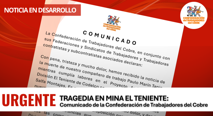 Con pena, tristeza y mucho dolor, hemos recibido la noticia de la muerte de nuestro compañero de trabajo Paulo Marín Tapia, mientras cumplía labores en el Proyecto Andesita de la División El Teniente de Codelco como trabajador de la empresa Salfa Montajes. Es por esto, que a través de este, expresamos nuestras sinceras condolencias a su familia, a quienes comprendemos y acompañamos en su profundo dolor, y desde ya, nos ponemos a su entera disposición para lo que estimen necesario, condolencias que, desde luego, extendemos a todas las compañeras y compañeros trabajadores de la División El Teniente, personal de la empresa Salfa y a los trabajadores contratistas y subcontratistas.