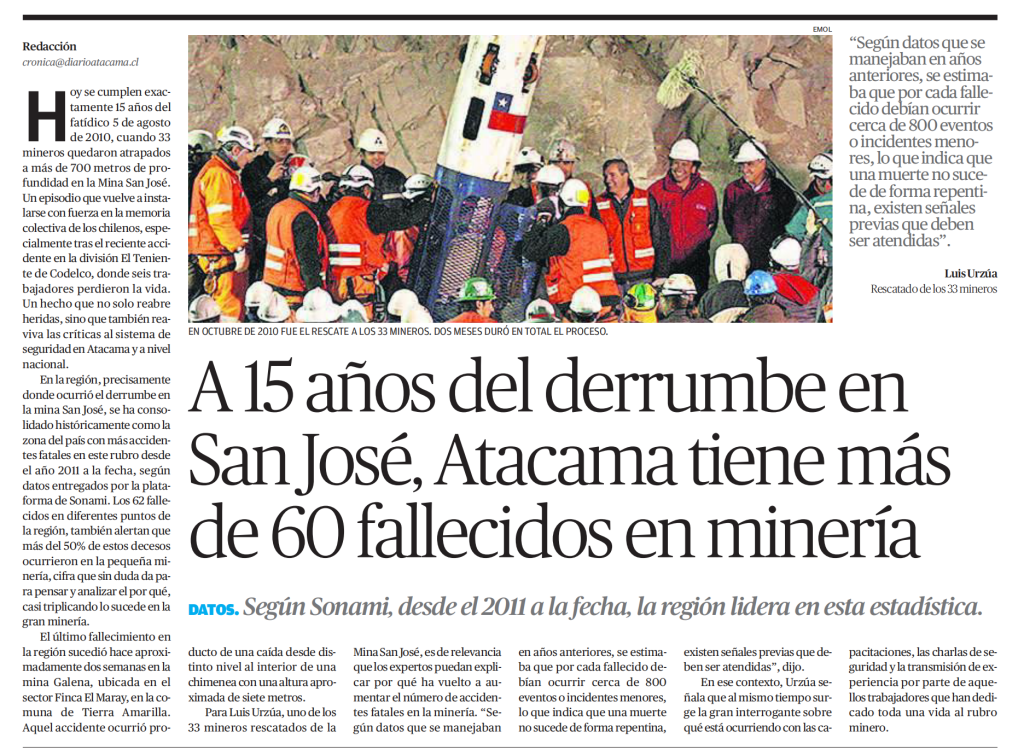 A 15 años del derrumbe en SanJosé, Atacama tienemás de 60 fallecidos en minería