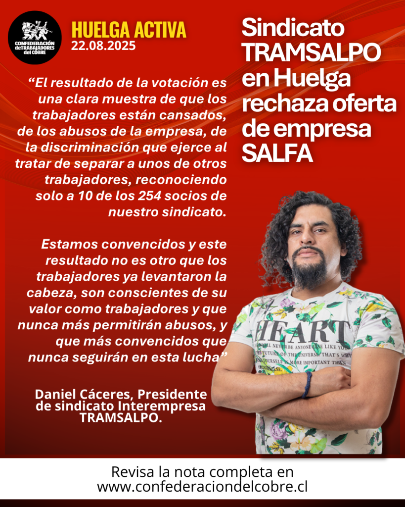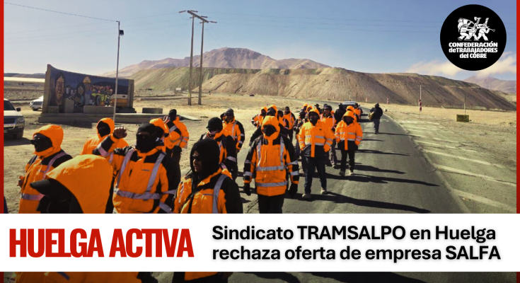 Los trabajadores cuyo sindicato es parte de la Federación de Sindicatos El Salvador, brazo orgánico de la Confederación de Trabajadores del Cobre, mantendrán la huelga en medio de múltiples apoyos y señales de solidaridad de clase que han recibido de parte de numerosas organizaciones de todo el país como la Central Unitaria de Trabajadores -CUT-, de Federaciones hermanas de la minería del cobre como la Federación Minera de Chile, FETRAMAC, FETRATEC, FEMINOR, FESITRAM y FESAMAV, y también de otras industrias como la Federación de Trabajadores Contratistas de ENAP Concon -FETRACON-, así como también, en la Comisión de Minería de la Cámara baja, el diputado Cristián Tapia, denunció el negligente actuar de la empresa SALFA en este proceso de negociación, y ofició a Codelco para entregar todos los antecedentes respectos del caso.