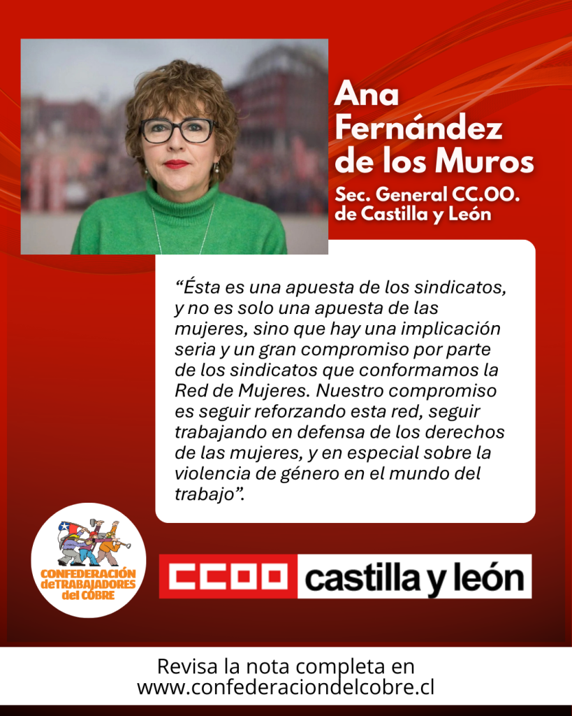 La Confederación de Trabajadores del Cobre, a través de su presidenta Ana Lamas Aguirre, valoró este importante encuentro, ya que estos vínculos permiten el fortalecimiento de las organizaciones hermanas en otros países del mundo, lo que es fundamental en estos días,  ante el avance de la ultra derecha en el mundo, para defender nuestros derechos y conquistas, y porque permite el intercambio de experiencias y generan acciones concretas en la defensa de las Mujeres para acabar con la violencia de género en el entorno laboral.