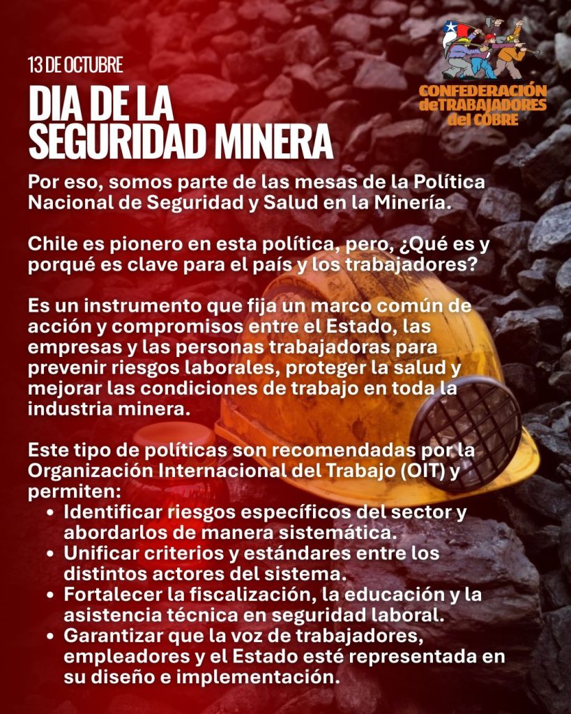 Como CTC participamos en diversas instancias de promoción por la seguridad de los trabajadores y trabajadoras, por ello es urgente implementar el convenio 176 de la OIT e implementar la Politica Nacional de Seguridad y Salud en la Minería (PNSSM).