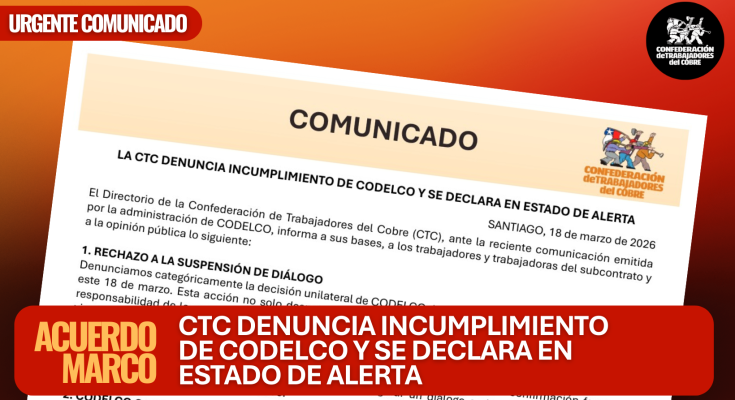 SANTIAGO, 18 de marzo de 2026 – El Directorio de la Confederación de Trabajadores del Cobre (CTC), ante la reciente comunicación emitida por la administración de CODELCO, informa a sus bases, a los trabajadores y trabajadoras del subcontrato y a la opinión pública lo siguiente: